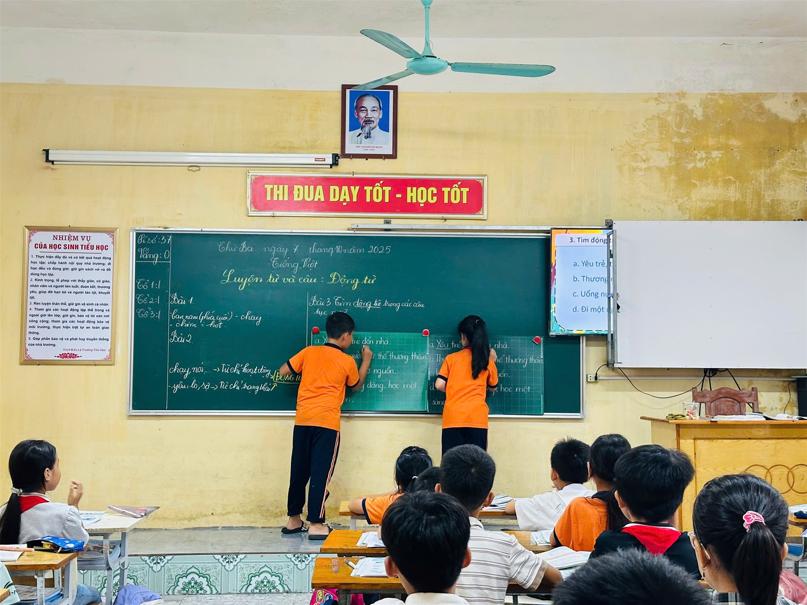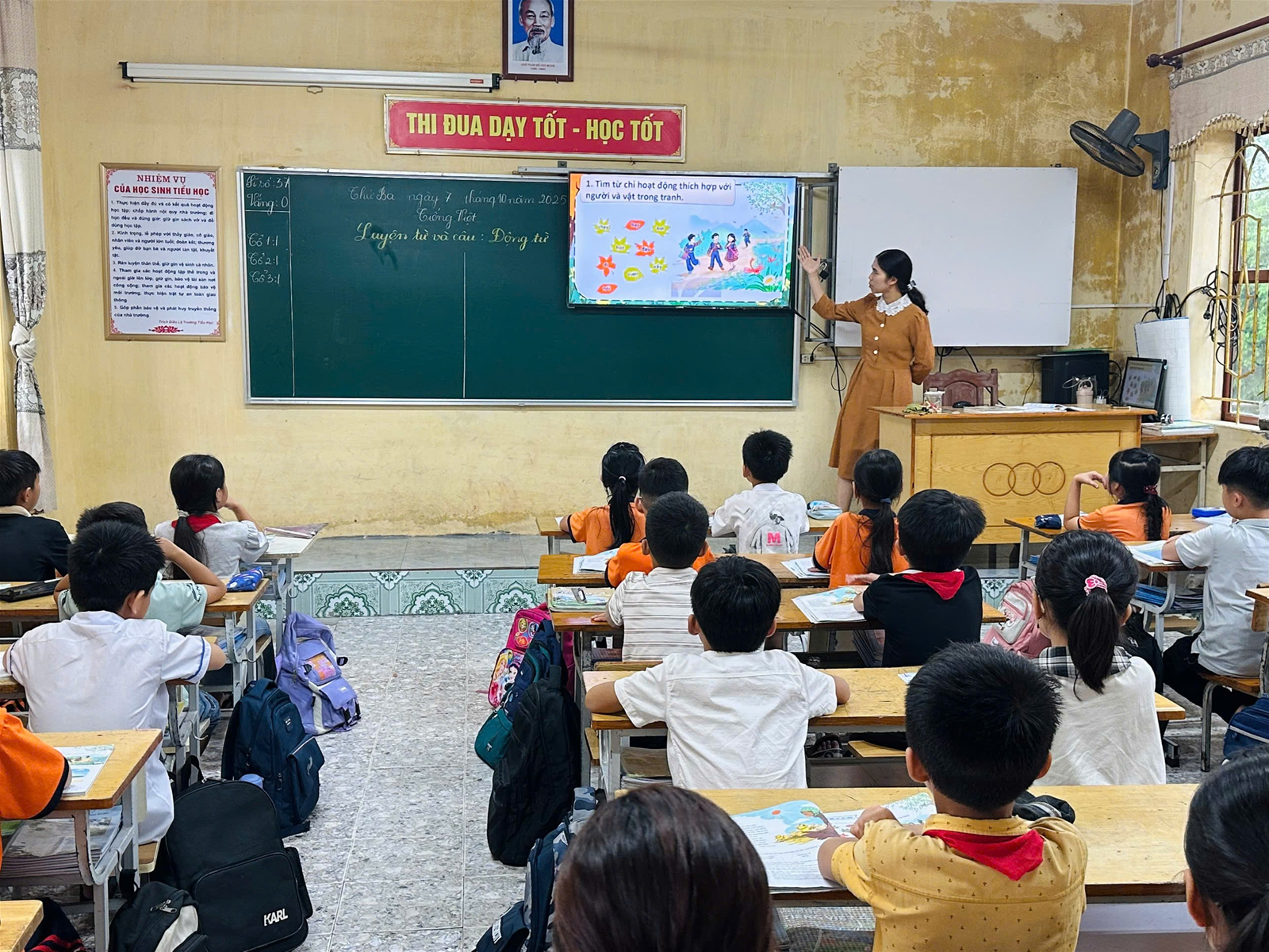 Trong tiết học, các em học sinh lớp 4C đã thể hiện tinh thần học tập tích cực, chủ động và hợp tác dưới sự hướng dẫn nhẹ nhàng, linh hoạt của cô giáo. Giáo viên vận dụng linh hoạt các phương pháp dạy học tích cực như “trò chơi học tập”, “thảo luận nhóm”, đồng thời kết hợp các kỹ thuật dạy học như sơ đồ tư duy, kỹ thuật trình bày một phút, giúp học sinh nắm vững khái niệm “động từ”, biết nhận diện và vận dụng vào phần thực hành. Các em được trải nghiệm, tự rút ra kiến thức thông qua hoạt động, phát triển năng lực giao tiếp tiếng Việt, năng lực hợp tác, tự học và giải quyết vấn đề. Không khí lớp học diễn ra sôi nổi, thân thiện. Học sinh tích cực giơ tay phát biểu, tự tin trình bày ý kiến trước tập thể, đồng thời biết lắng nghe và bổ sung ý kiến cho bạn. Cô giáo luôn quan sát, nắm bắt kịp thời những khó khăn của học sinh để có biện pháp hỗ trợ phù hợp, hiệu quả.