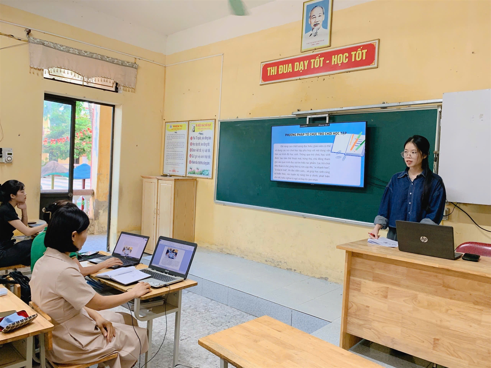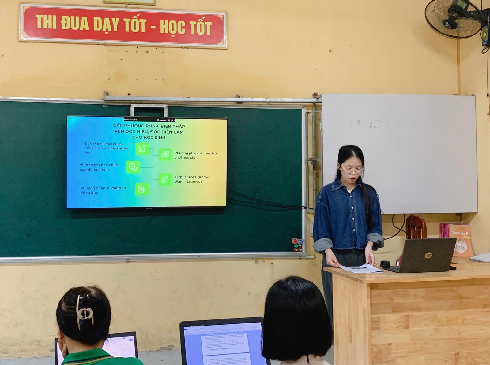 Trong phần báo cáo, cô đã chia sẻ các cách làm, phương pháp, kĩ thuật dạy học tích cực, sáng tạo và dễ áp dụng như: học theo nhóm, sơ đồ tư duy, trò chơi học tập, kỹ thuật KWL…và ứng dụng công nghệ thông tin để tiết học thêm sinh động, học sinh có cơ hội được tham gia, trao đổi, thể hiện ý kiến cá nhân giúp việc đọc hiểu, đọc diễn cảm trở nên thú vị và hiệu quả hơn.