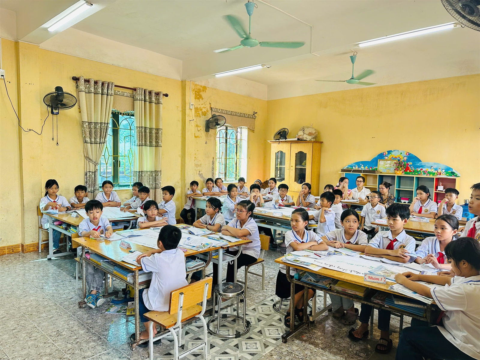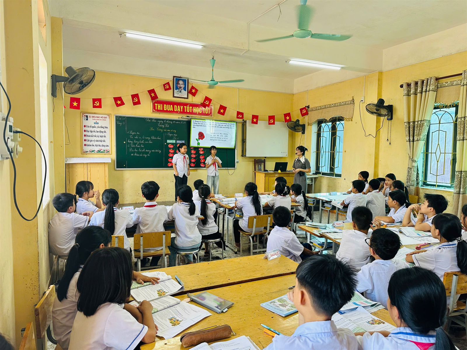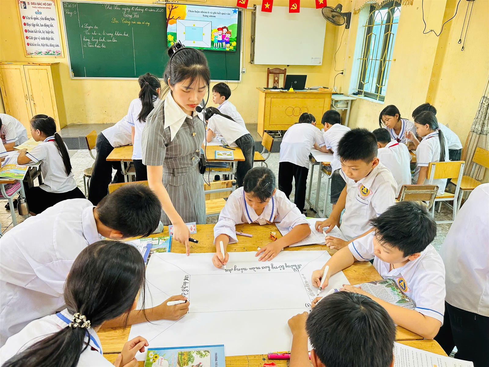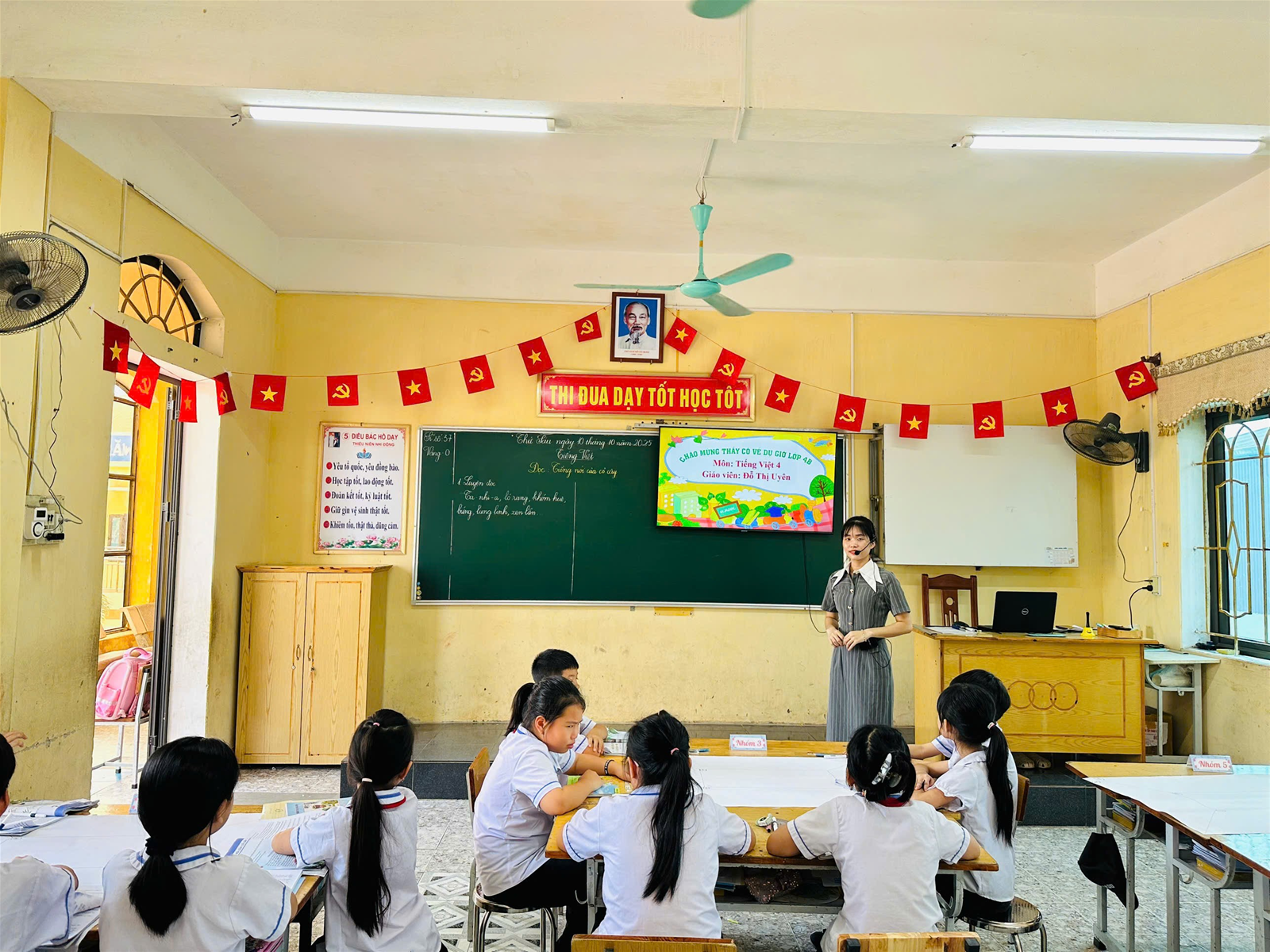 Tiếp nối chuyên đề, ngày 10/10/2025, cô Đỗ Thị Uyên - tổ phó Tổ 4-5 đã thực hiện dạy minh họa bài Đọc: Tiếng nói của cỏ cây (tiết 2) tại lớp 4B. Trong tiết học, cô đã áp dụng lý thuyết chuyên đề, vận dụng linh hoạt các phương pháp, kĩ thuật dạy học tích cực trong hoạt động hướng dẫn học sinh đọc hiểu, đọc diễn cảm, luyện tâp theo văn bản. Các em học sinh vô cùng hào hứng, tích cực thảo luận, say mê khám phá vẻ đẹp của thiên nhiên, biết lắng nghe “tiếng nói” dịu dàng của cỏ cây qua từng câu chữ. Không khí lớp học thật sôi nổi, thân thiện – tiếng cười, tiếng đọc vang lên rộn ràng khắp lớp học!