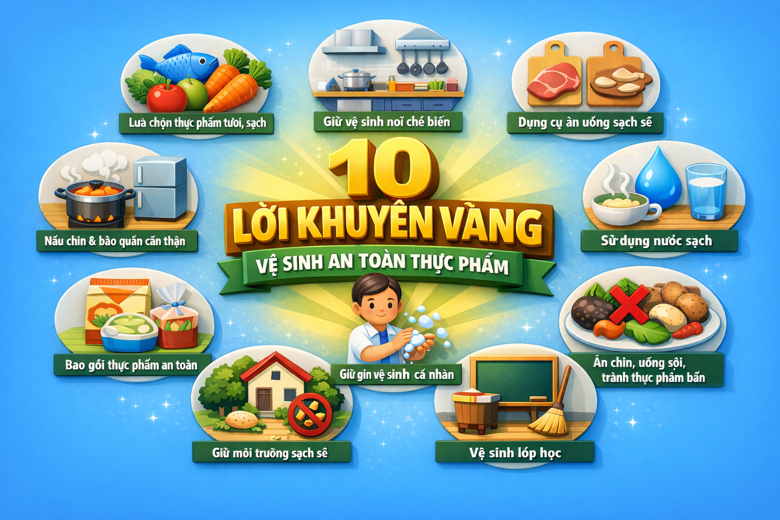 9. Thực hiện ăn chín uống sôi, không nên ăn đồ ôi, thiu, mốc, có mùi lạ hoặc hết hạn sử dụng, hạn chế ăn quà vặt không rõ nguồn gốc bán rong trước cổng trường.